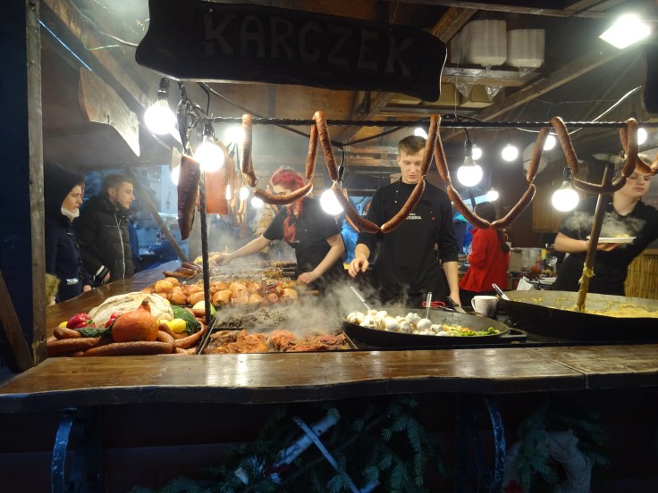 I decided it would be a good time to check out the Christmas market – where I actually did most of my meals for my time in Krakow. Their market is rated one of the best in Europe. Having been to only three I agree it is quite good! I spent a lot of time wandering into the stalls and drinking mulled wine. I went probably 3 times each day I was there. There were several booths with gorgeous handmade items (a lot of lovely embroidery, felted wool and wooden utensils). My favourite thing to buy was beautifully decorated gingerbread cookies which were soft and perfect. They were the dessert of every meal ha! My first meal consisted of a magical kielbasa with cabbage and some mulled wine. (it was lunch).